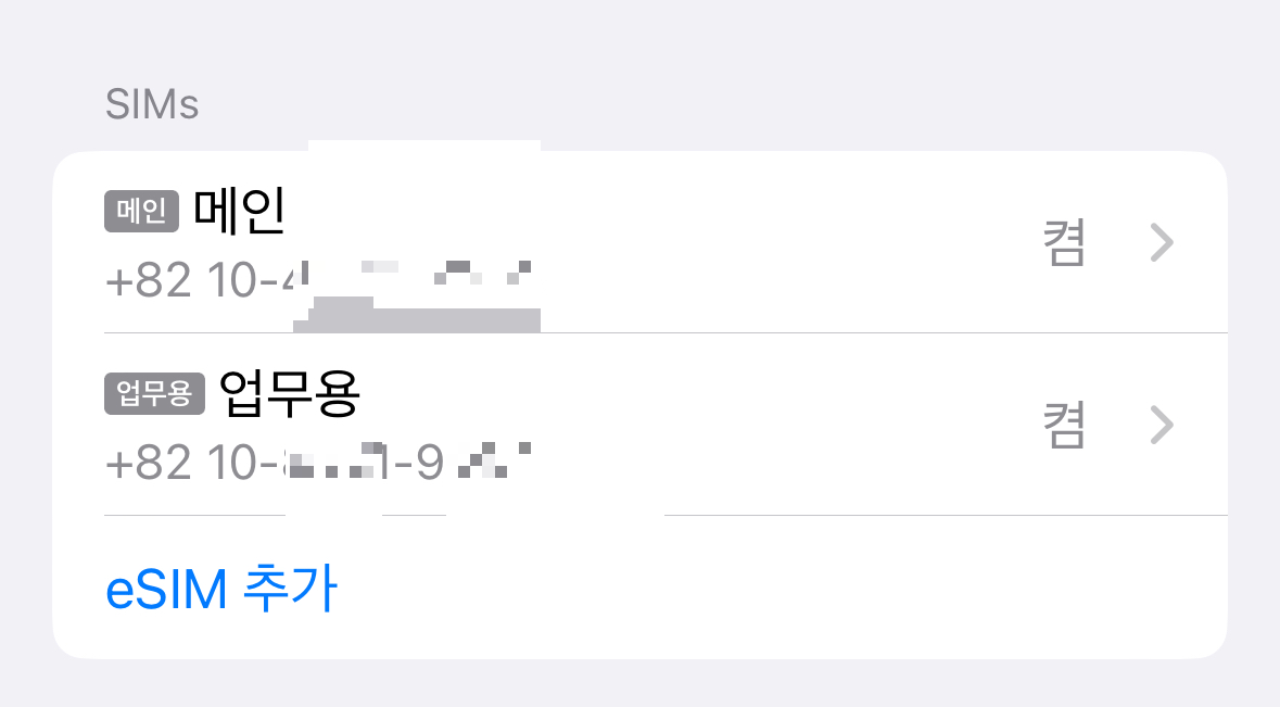 - 'SIMs' 메뉴를 찾아서 클릭합니다. 이 메뉴에는 두 개의 번호가 있을 것이며, 이 중에서 eSIM으로 개통한 번호를 선택합니다.