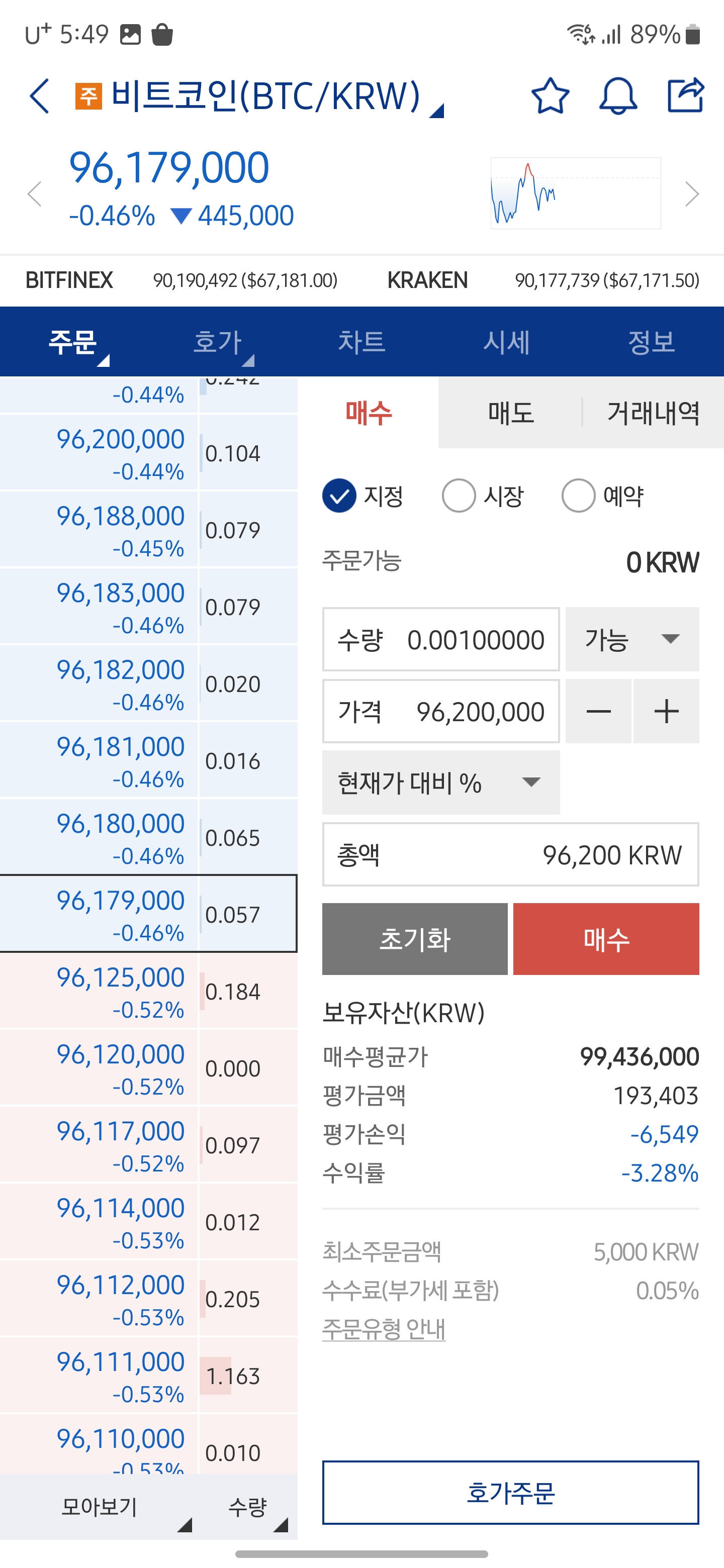 비트코인은 소수점 8자리 단위로 구매 가능합니다. 하지만 소수점 8자리 최소한 금액으로 구매는 현재 불가능 합니다. 최소 거래 금액 5천원을 넘지 못하기 때문입니다. 0.001 비트코인을 매수하면 현재 비트코인 시세로 96,200원으로 매수 가능합니다.
